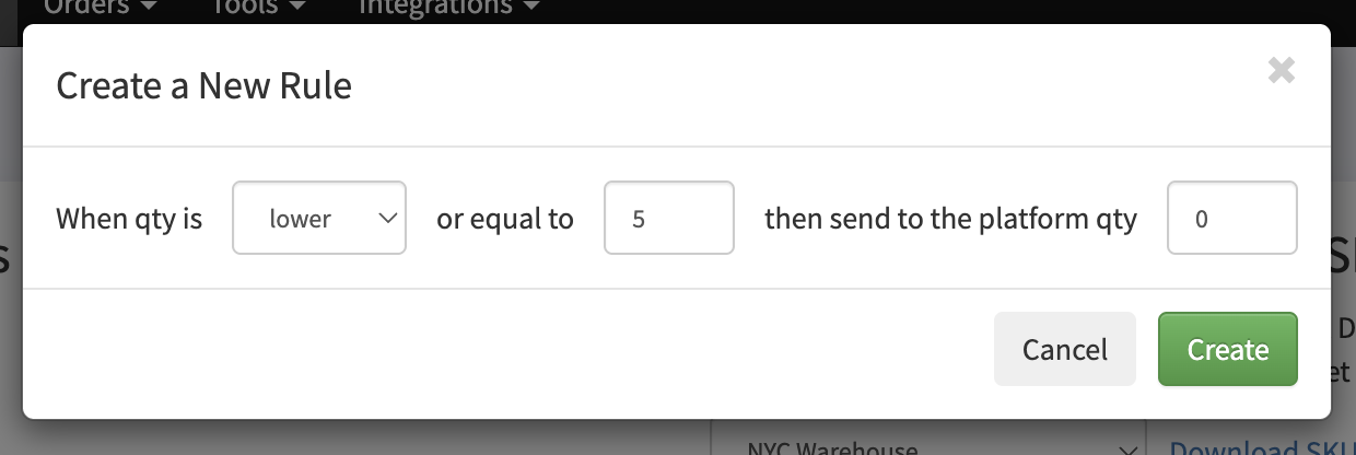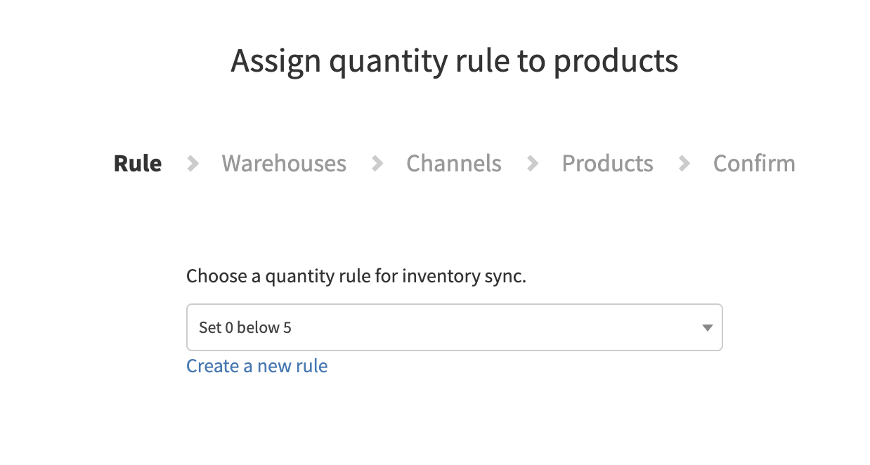 - Start by creating a new rule. Click the “+ Rule” button. In this case, we want to send 0 to a warehouse when the quantity drops below 5, so we prevent any overselling.