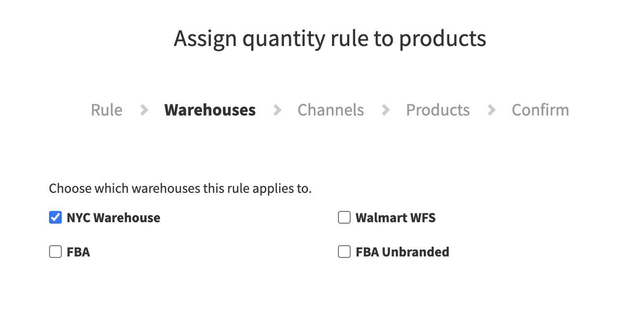 - Next, select the warehouse you want this rule to apply to. In this case, select the warehouse called NYC Warehouse, as it is connected to your Walmart store.
