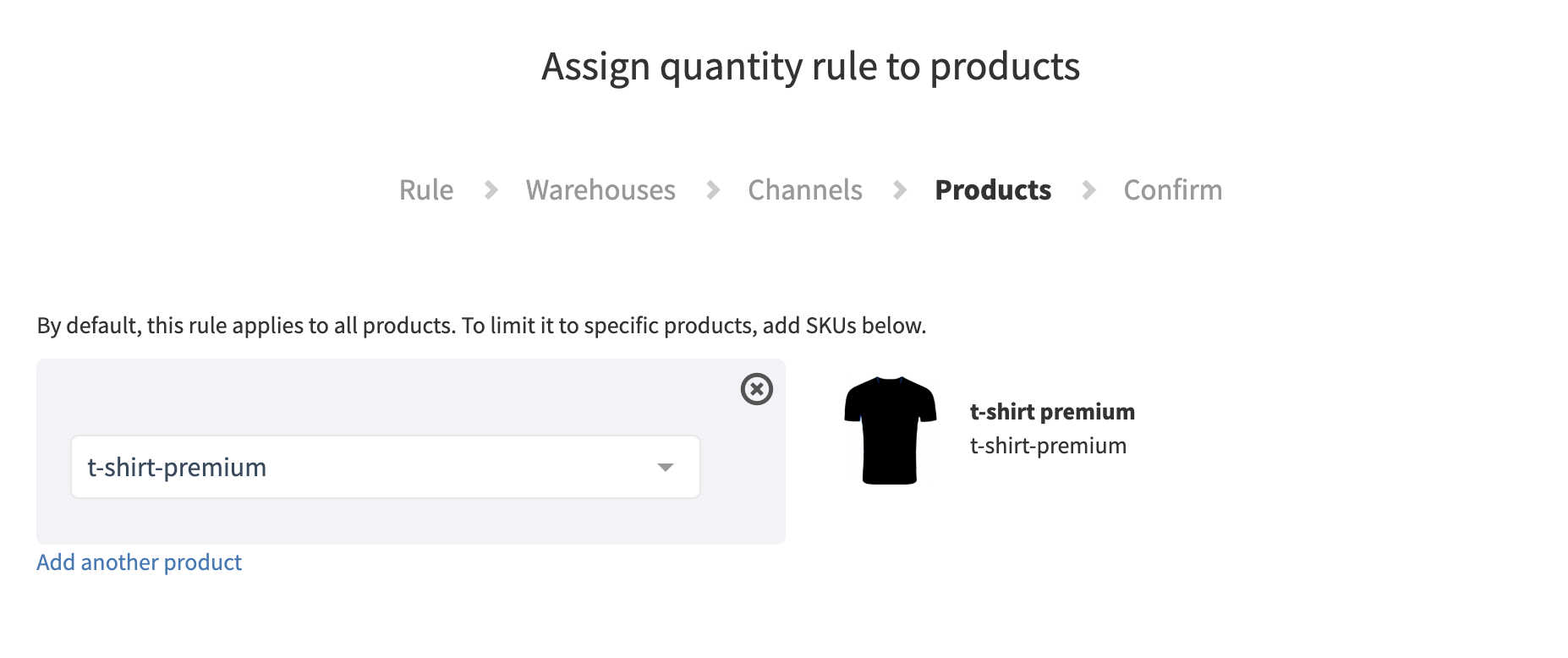 - Next, select the product you want this rule to apply to.Please note: if you do not select any products here, the rule will apply to all products stored in the selected warehouse.