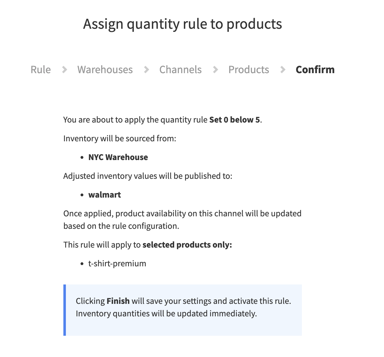 - The last step is just a confirmation that provides a description of what you are about to activate. Click Finish to apply the rule.