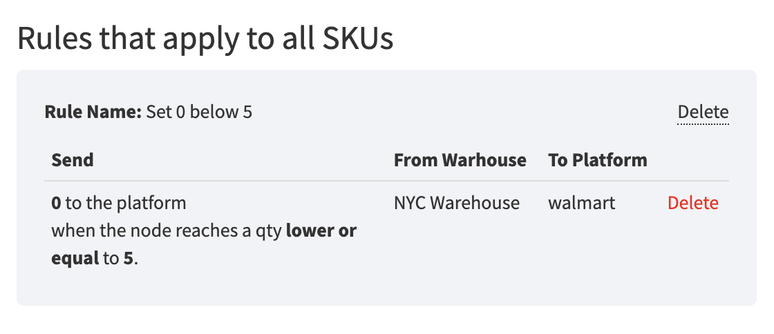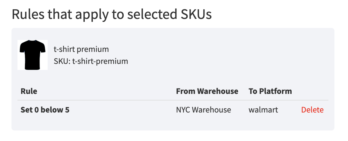 - Below is how this will look after implementing it. As you can see, the rule is listed under Rules Applied to Specific SKUs. To unassign the rule, simply click Delete next to it.