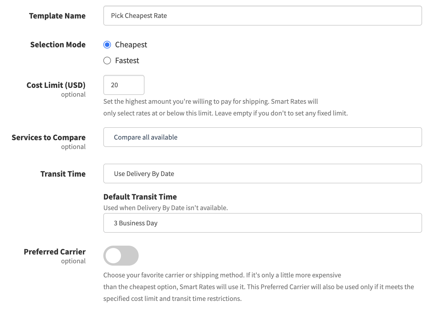 Preferred Carrier (optional): This option lets you set a preferred carrier (for example, UPS Ground) that Smart Rates will prioritize, even if it’s not the absolute cheapest. You can define a price tolerance — for instance, $1 more than the lowest rate — and if your preferred carrier’s price falls within that range, GeekSeller will automatically select it. This helps you stay consistent with your favorite or most reliable carrier while still keeping costs low. Of course, this preferred carrier will be selected only if it is within the specified Cost Limit and meets the Transit Time expectations.